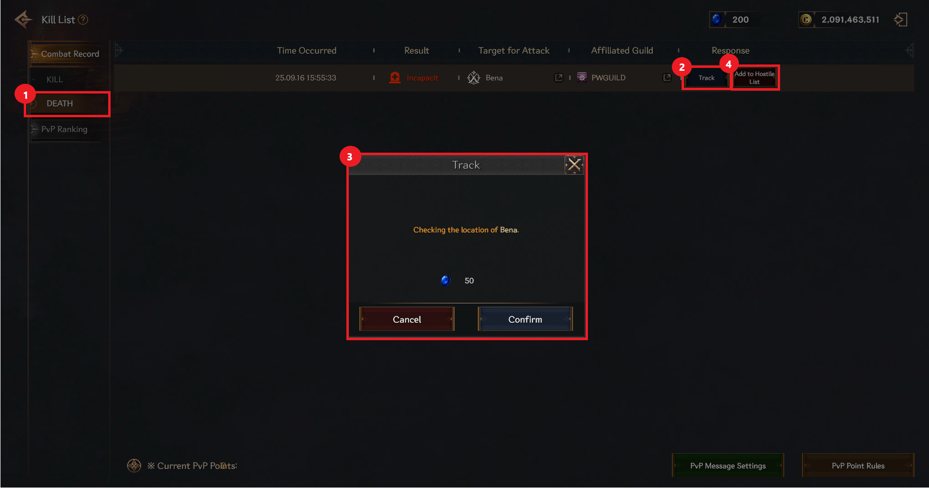 ① You can check the record of players you have PKed and the PvP points gained.