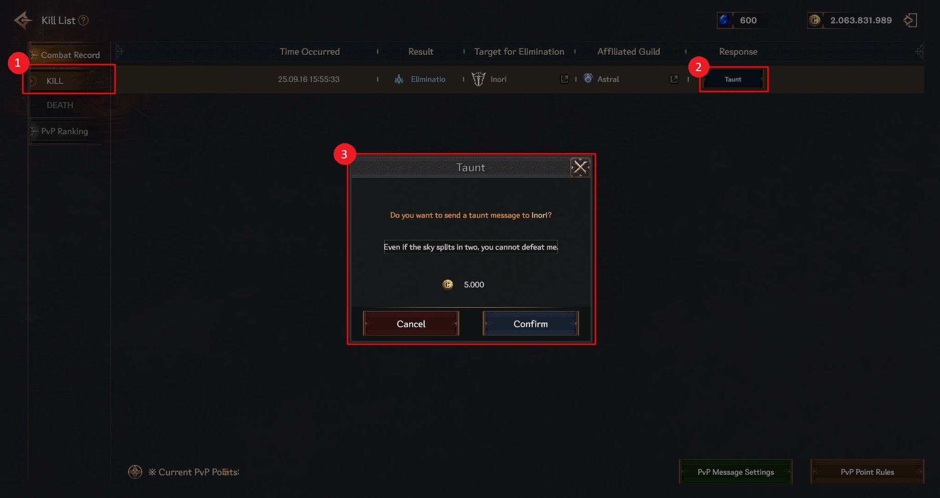 ② By selecting the [Taunt] button, you can taunt each player you PKed once per target.