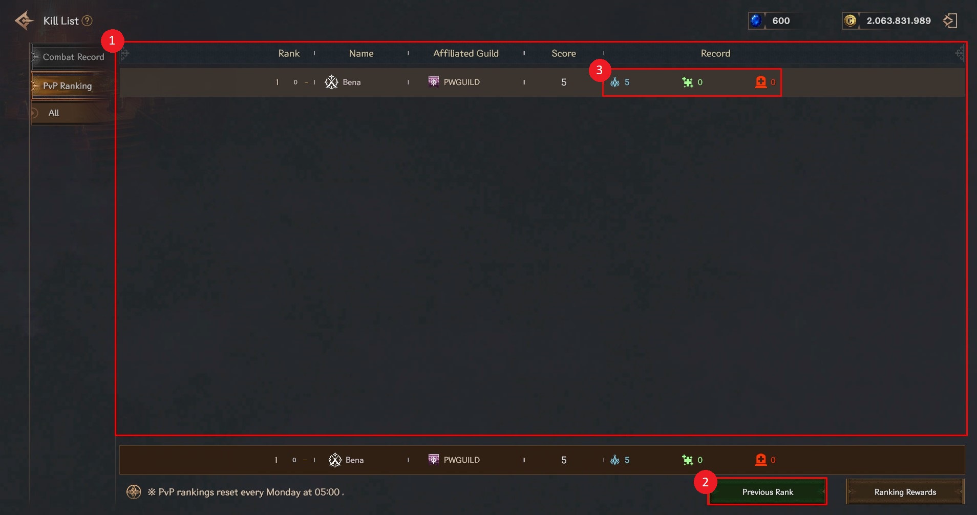 ① You can check the character info of the top 1–100 players based on PvP points.