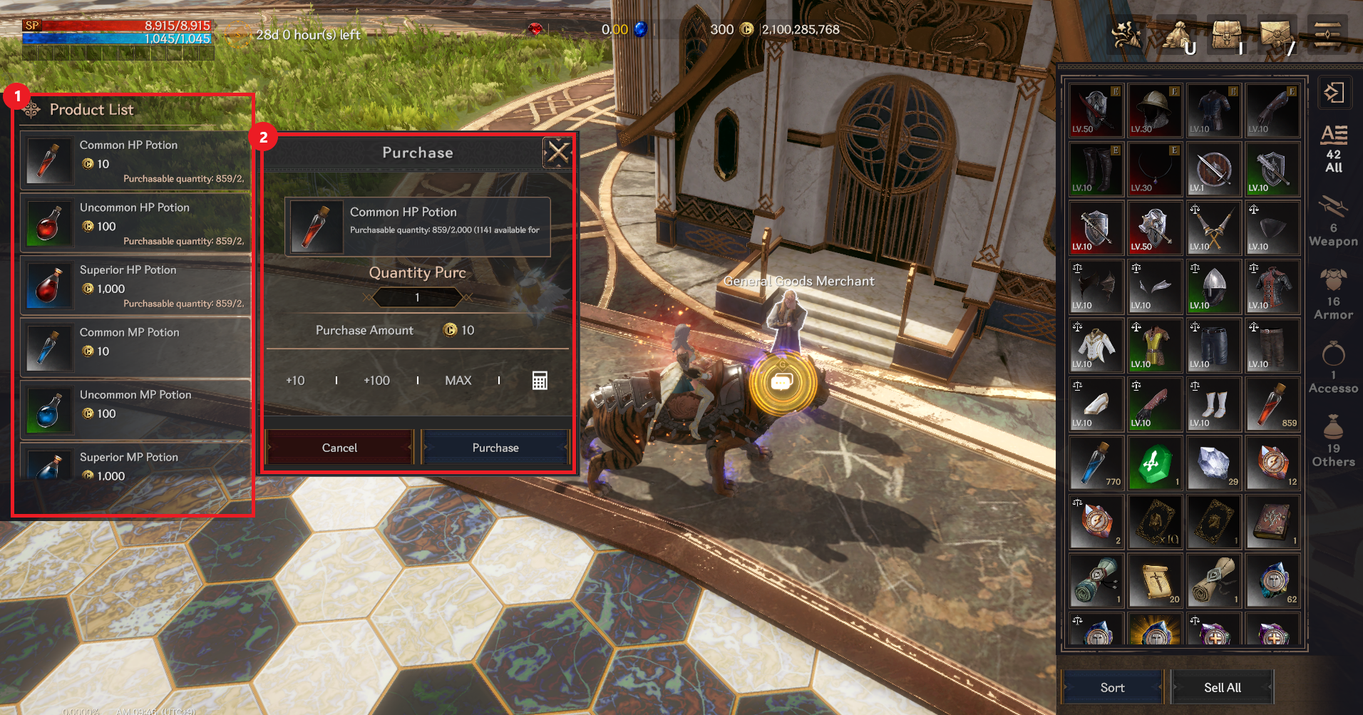 ① You can check the items on sale, and some items have restrictions on quantity and level.