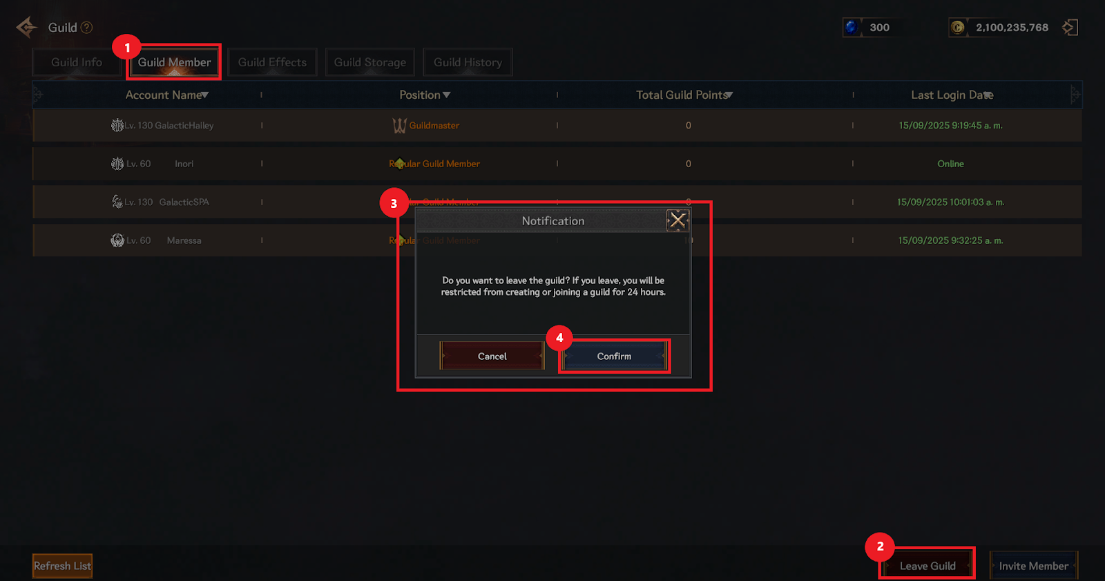 ③ Check the notification window that appears stating that if you leave a guild, you will be restricted from creating or joining a new guild within 24 hours.