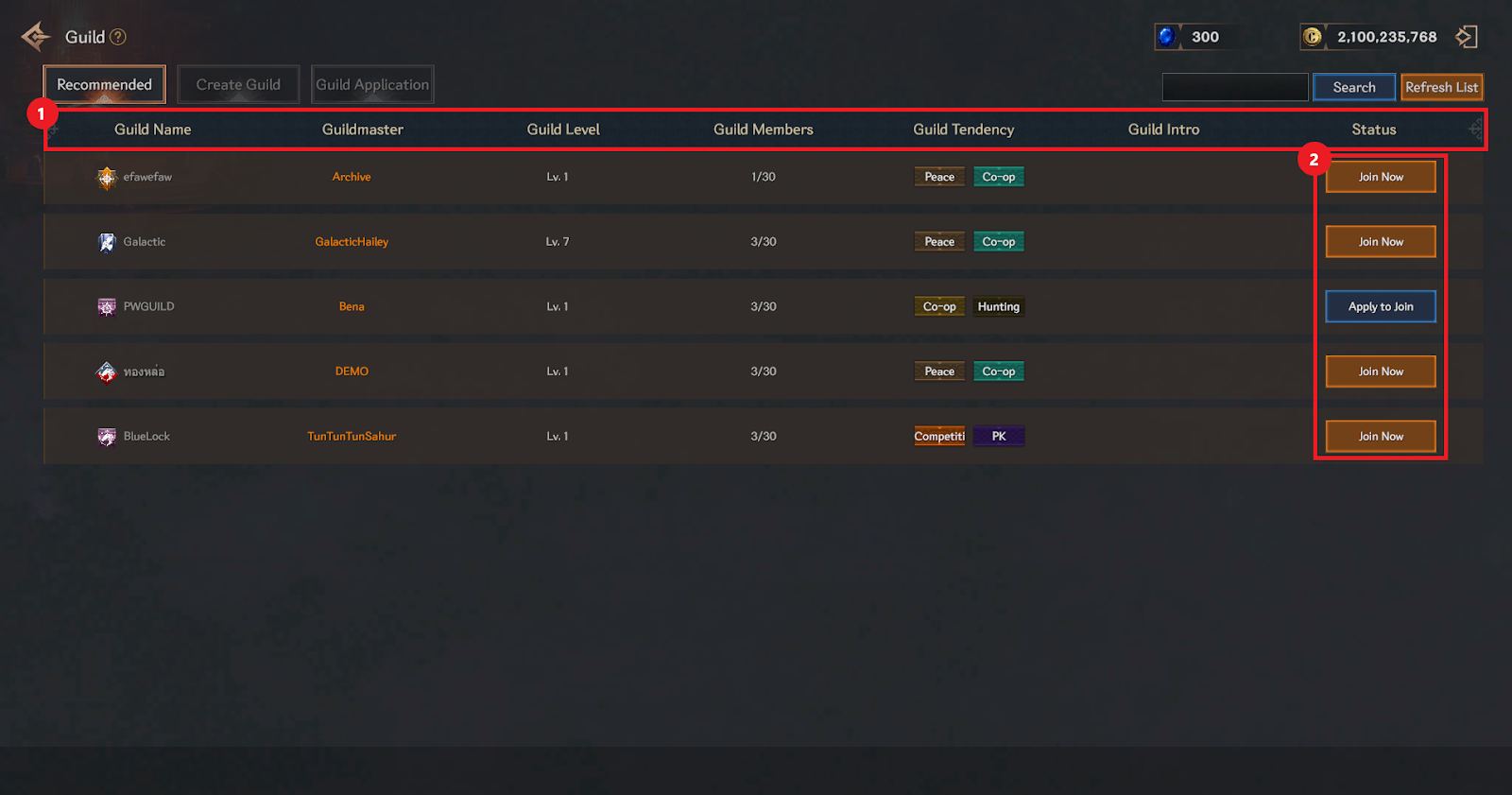① You can check the guild name/guildmaster/guild level/guild members/guild tendency/guild introduction/status.