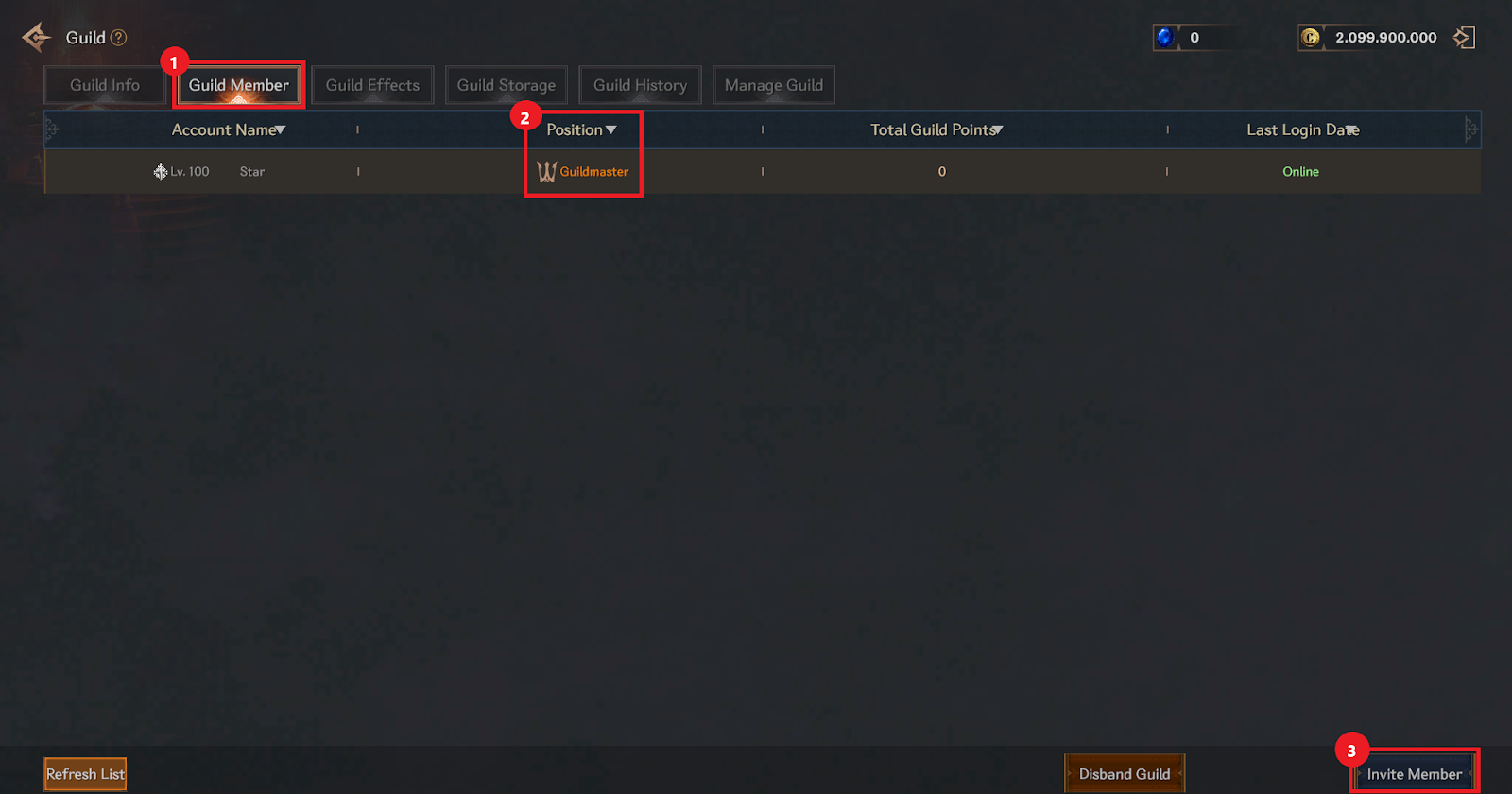 ① You can check and manage the guild member list in the Guild Member tab.