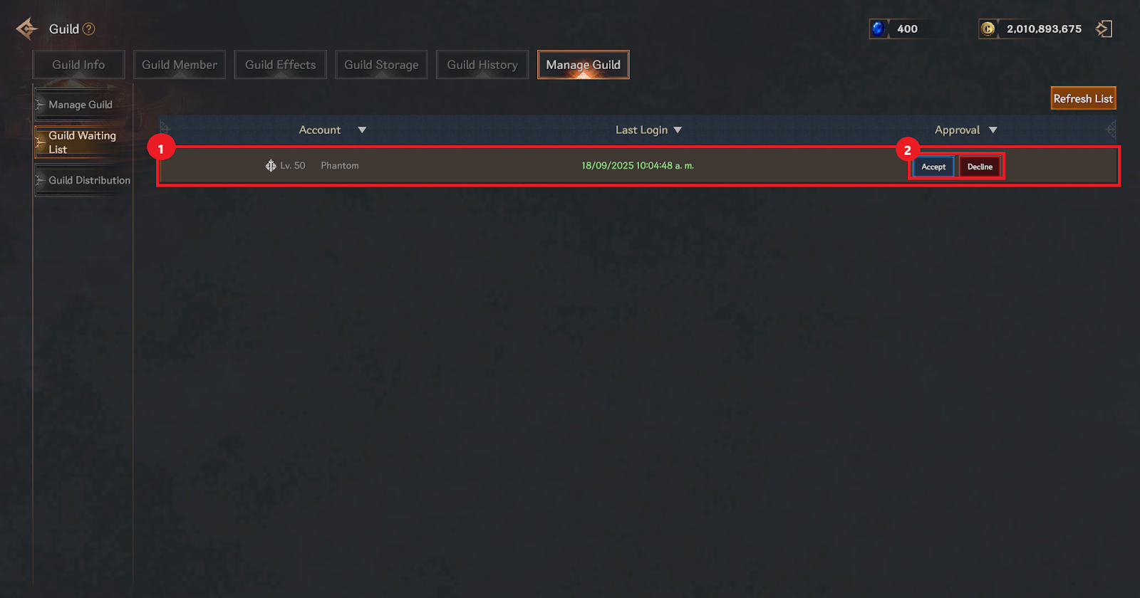 ① Application Status When an application for guild membership is received, you can check the information of the player who applied for membership in the guild waiting list.