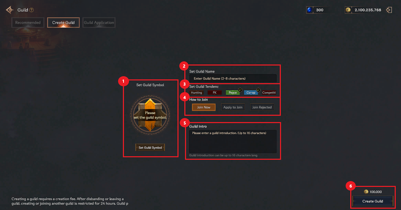⑥ You can create a new guild by spending 100,000 crons.