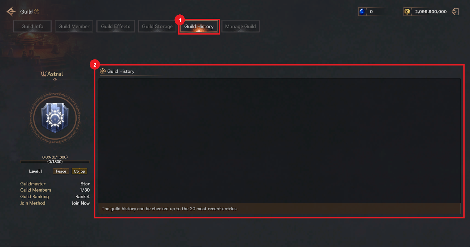 ① You can check the history of guild activities in the Guild History tab.