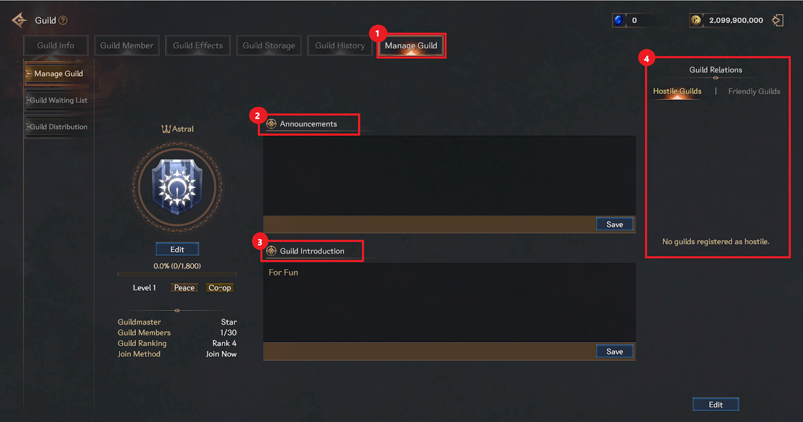 ② Depending on your position, you can change and edit guild-related settings such as the guild emblem or introduction.