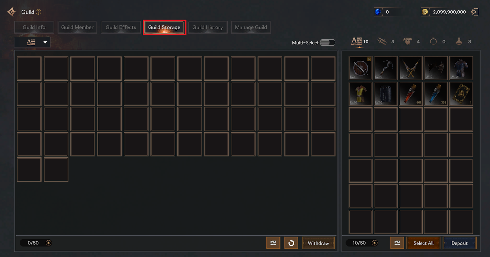 > You can store items in the guild warehouse. The initial 50 slots are provided and can be expanded up to a maximum of 250 slots.