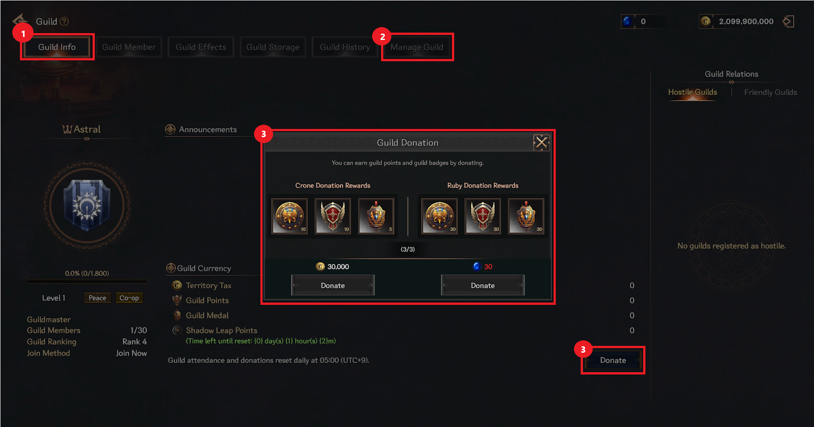 ③ You can donate crons and sapphires to earn guild points and coins.