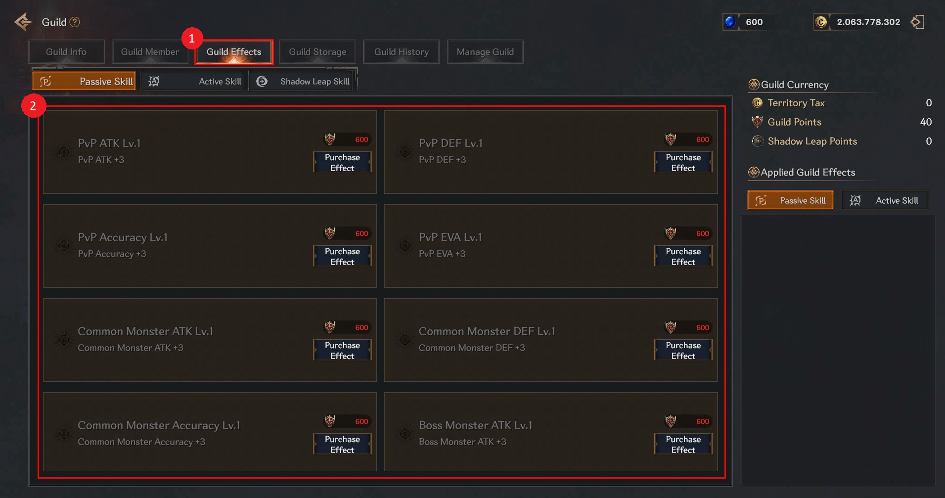 ① You can check and manage the list of guild effects in the Guild Effects tab.