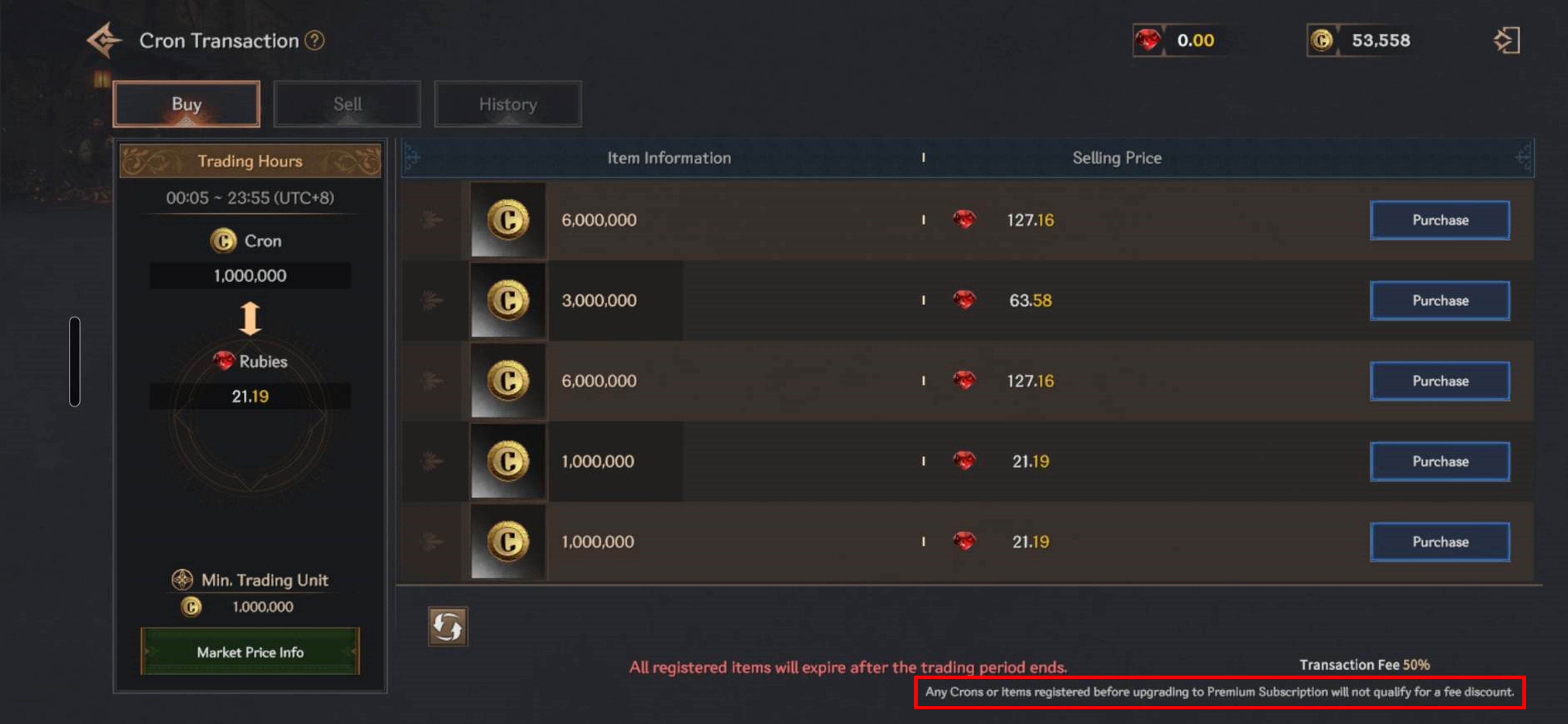 - If you listed an item or cron before activating Premium Subscription, the listing will keep the original 50% fee rate.