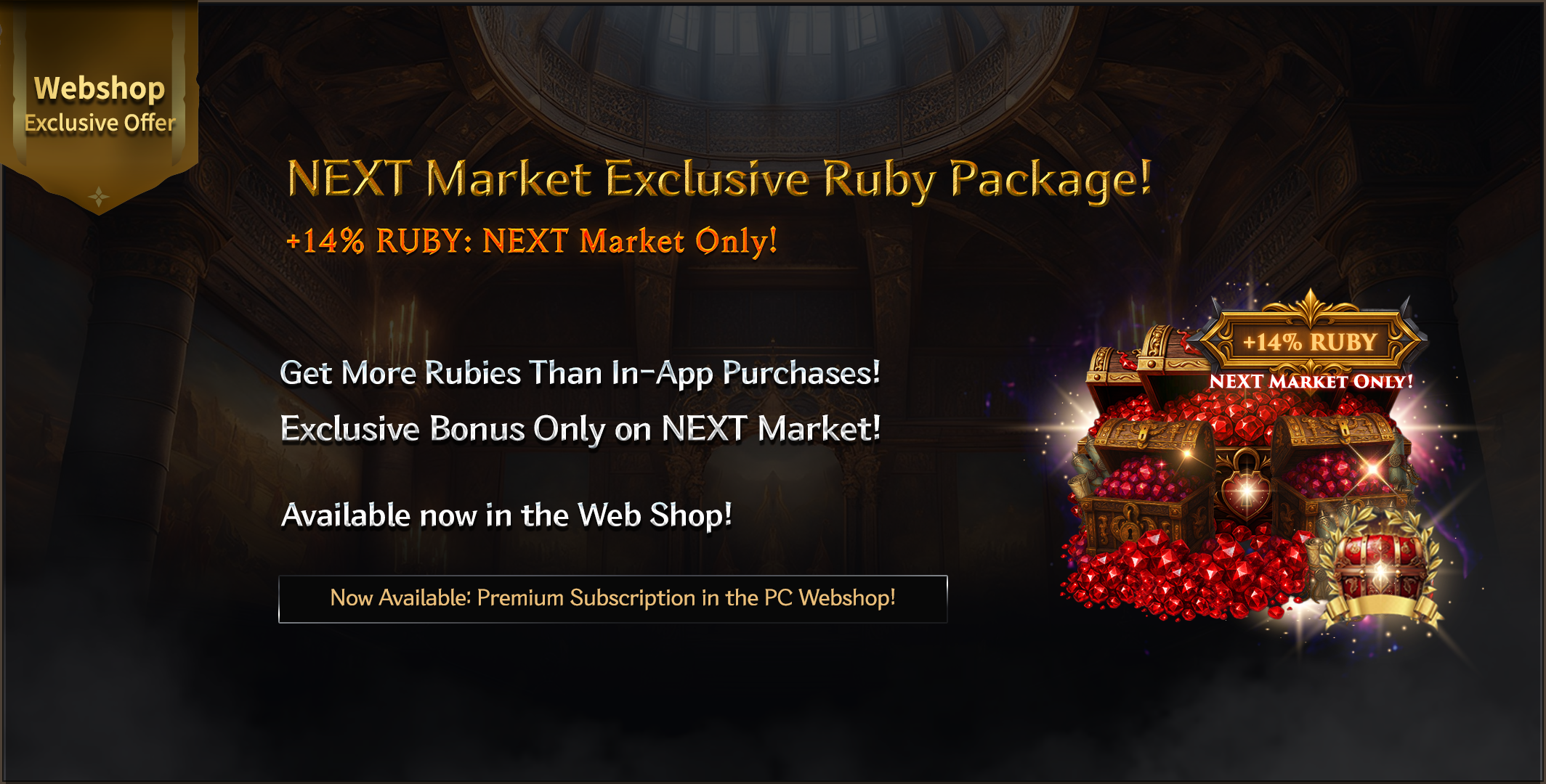 - Due to marketplace fee adjustments, ruby products sold exclusively on NEXT MARKET will provide 14% more ruby compared to those in the in-game shop.