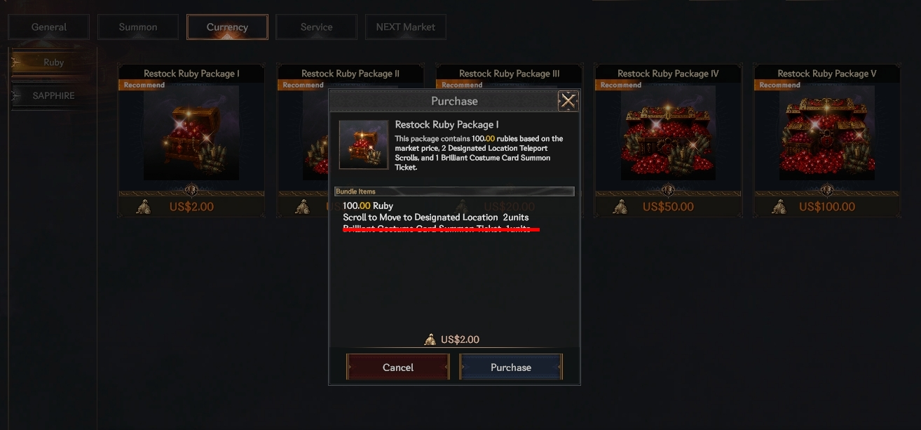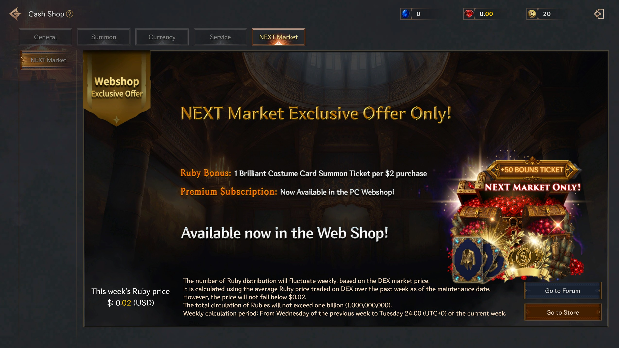 Users who purchase ruby products from the Next Market will now receive a 1 Brilliant Costume Summon Ticket per $2 purchase as a special bonus.