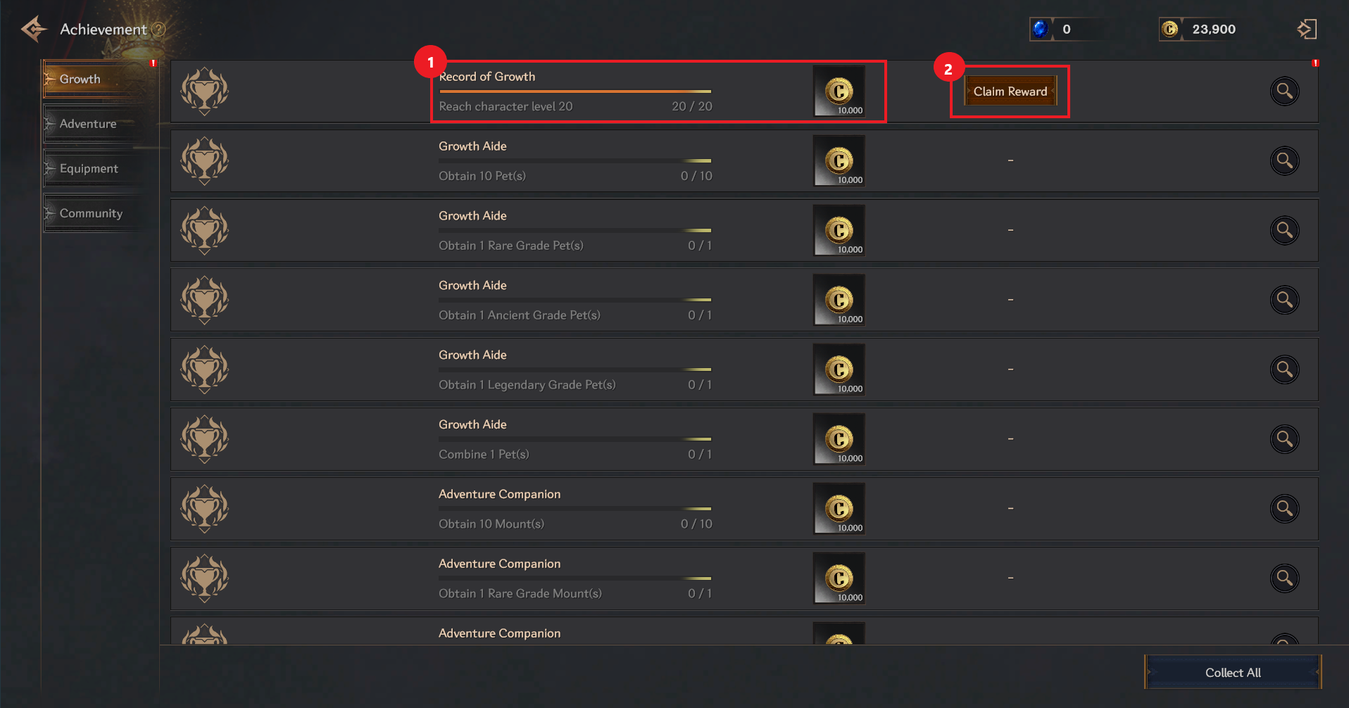 ① You can check the achievement goals, progress, and rewards.