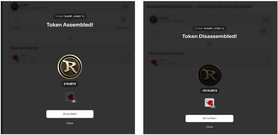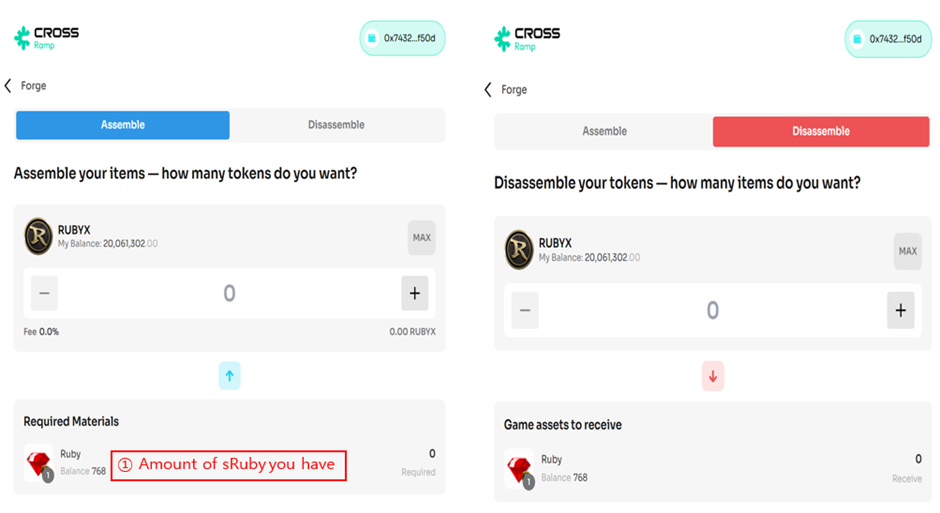 Wallet connection is required to use any Assemble or Disassemble functions, and to check your token balance. If you don't have enough materials or tokens, you won't be able to proceed with the exchange. Some Pairs may support only Assemble or only Disassemble, meaning the conversion cannot be reversed. Please double-check the direction before proceeding.