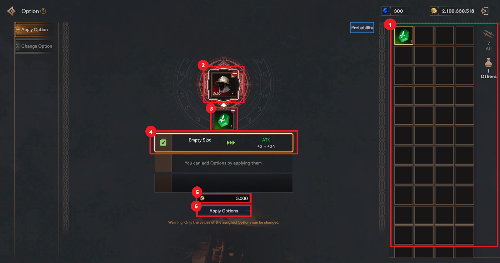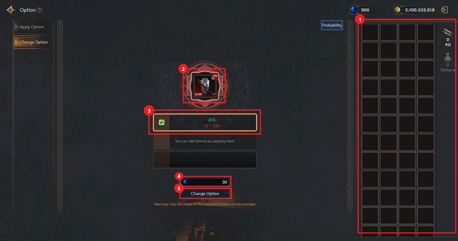 ④ You can check the cost required to change the option. The cost varies depending on the option slot class.