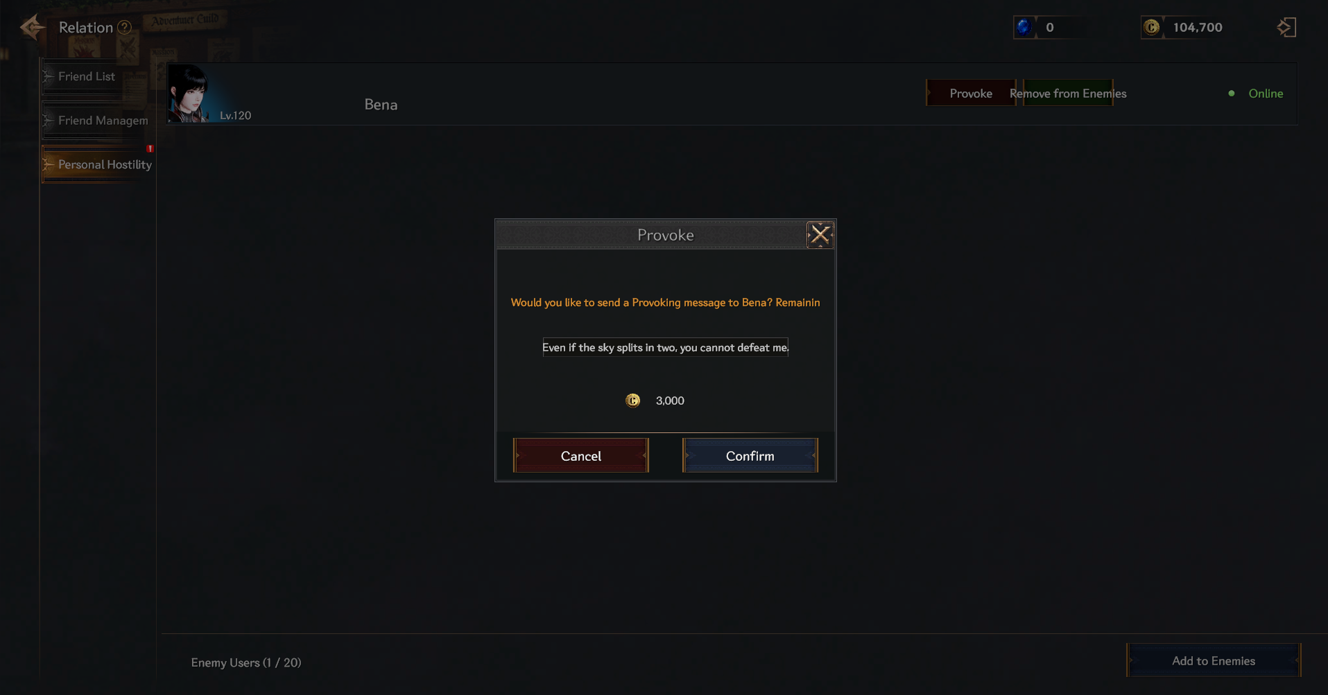 > If you choose to provoke, you can send a provocation message to the hostile user by spending a certain amount of cron.