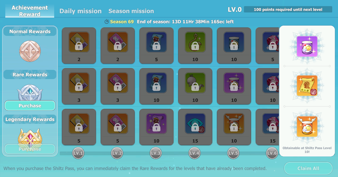 • Normal rewards can be obtained by leveling up your Shiltz Pass.