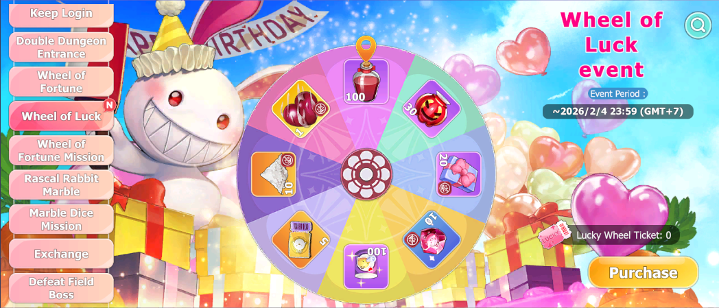 • In order to use Special Wheel of Luck for your character you need to unlock it using 1000 rubies and acquire Lucky Wheel Ticket in the event's menu.
