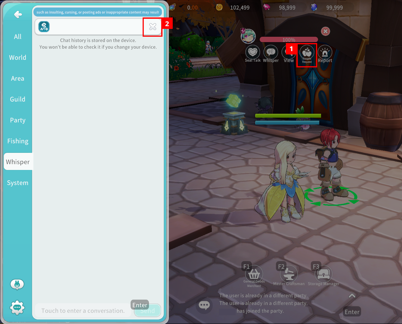 ① Tap a character to open their chat window. (Whisper chat history is stored locally on the device. If you change devices, previous messages cannot be viewed.)