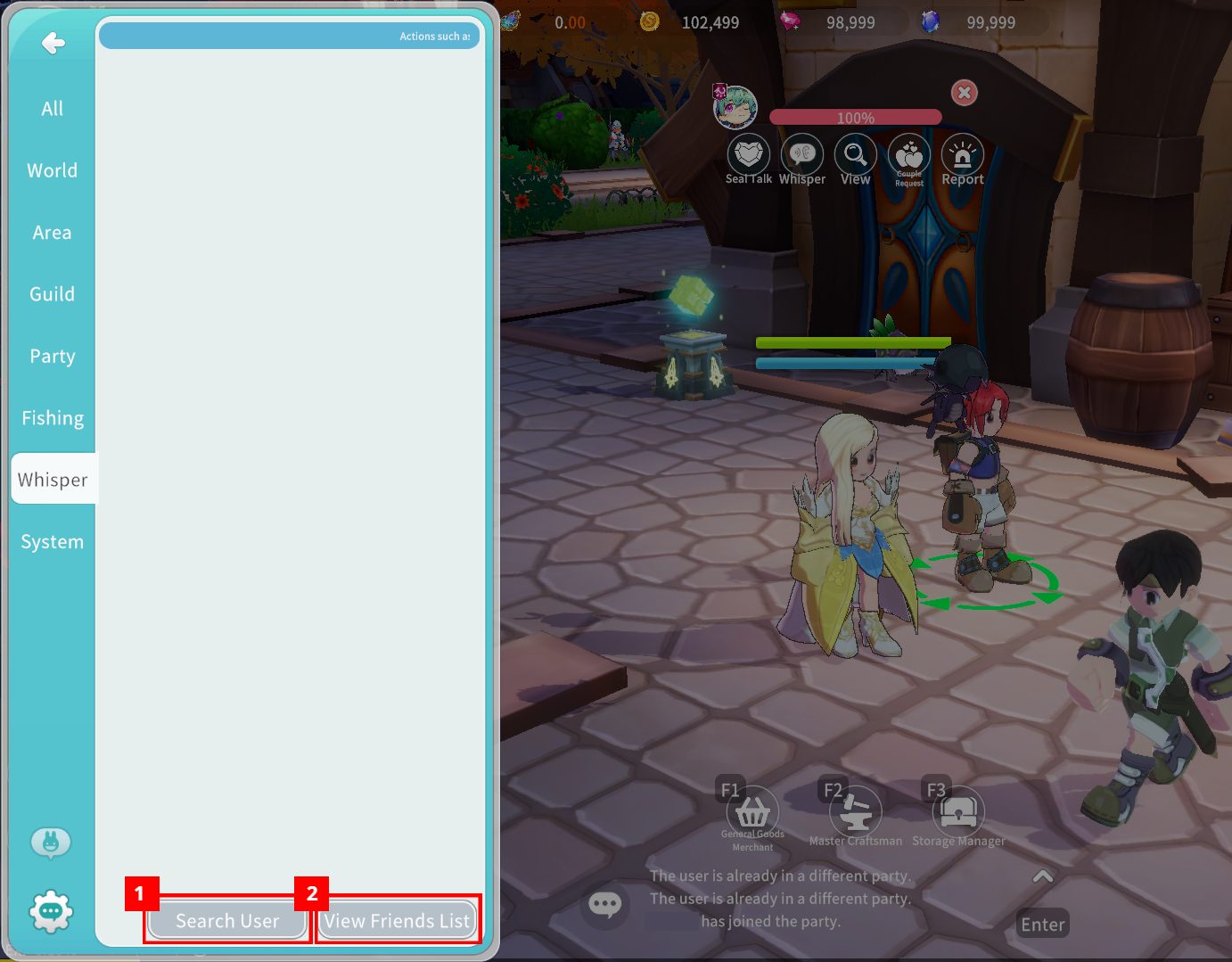 - Whisper: Send 1:1 messages to friends. (Whispering is only available between friends.)