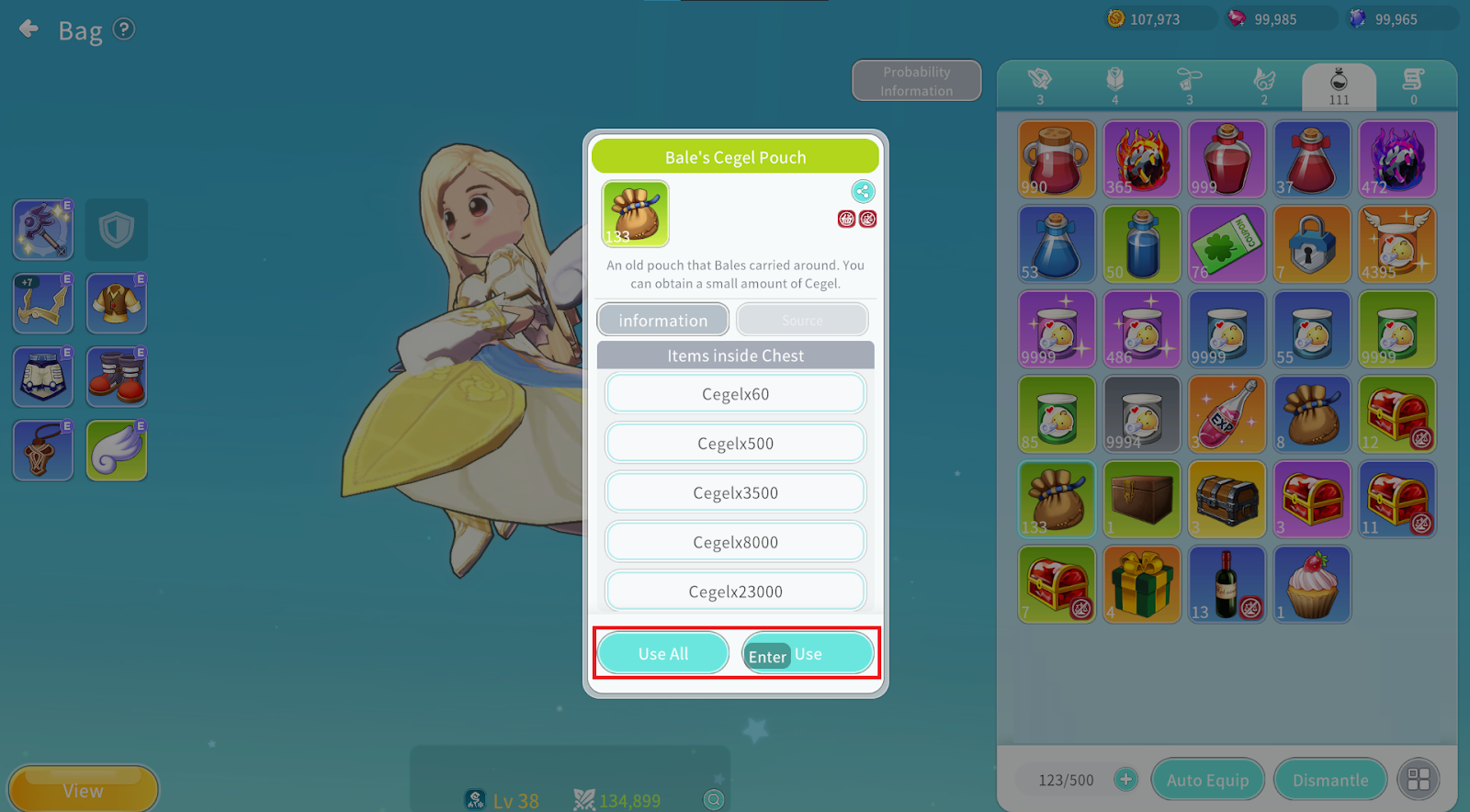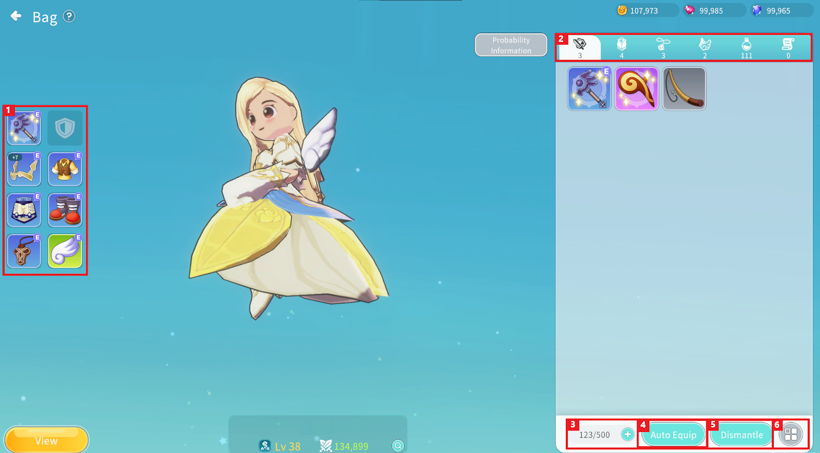 Obtained items can be checked in the Bag. By opening the Bag, you can equip Equipment or use items.