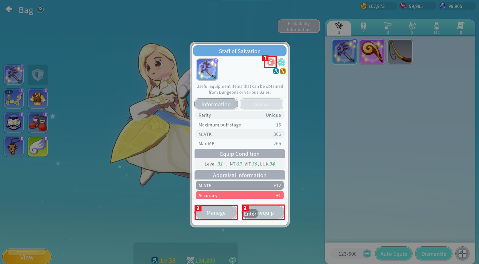 ② Tap the “Manage” button to enhance, combine, dismantle, or appraise Equipment.
