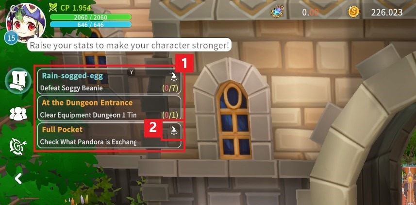 ① You can check the name and objective of the Quest currently in progress. Tapping a Quest will automatically move your character to the Quest location.