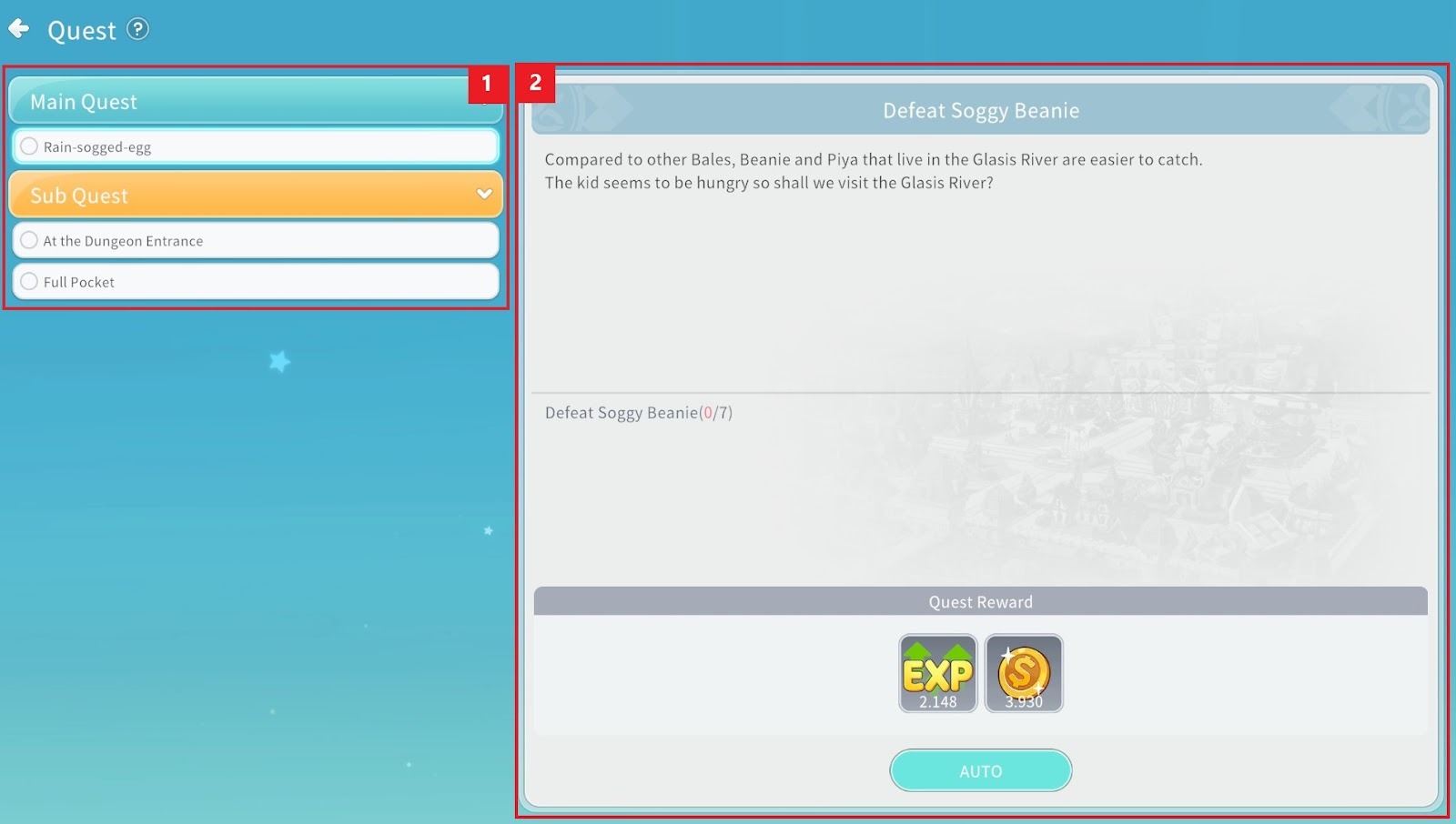 ② You can check the Quest details, objectives, and rewards. Pressing the “AUTO” button will automatically proceed with the Quest.