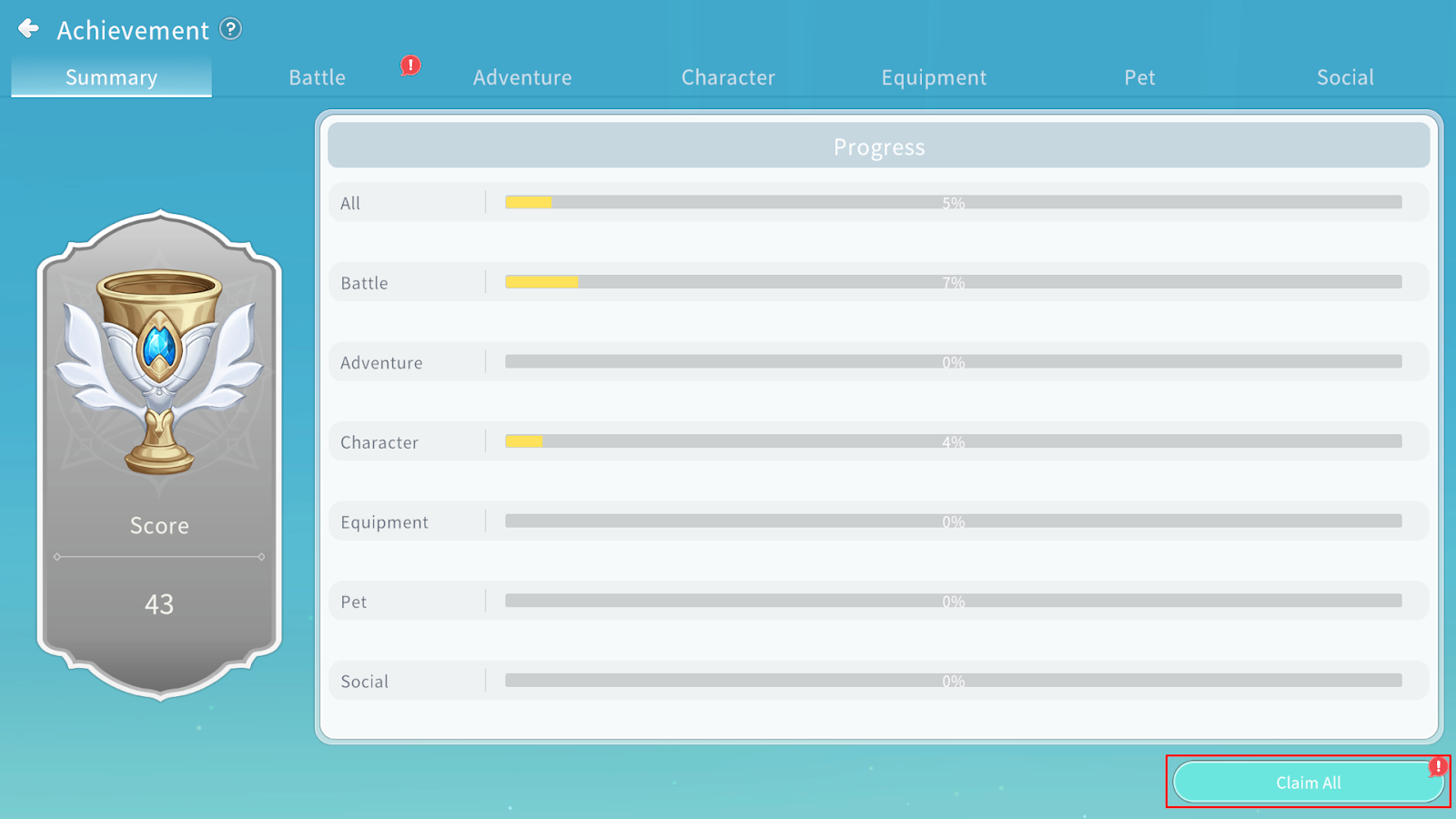 Completed Achievement rewards can be claimed all at once using the [Claim All] button.