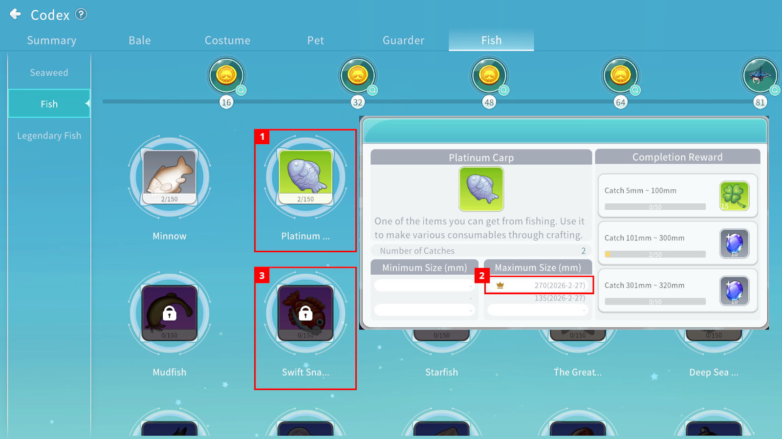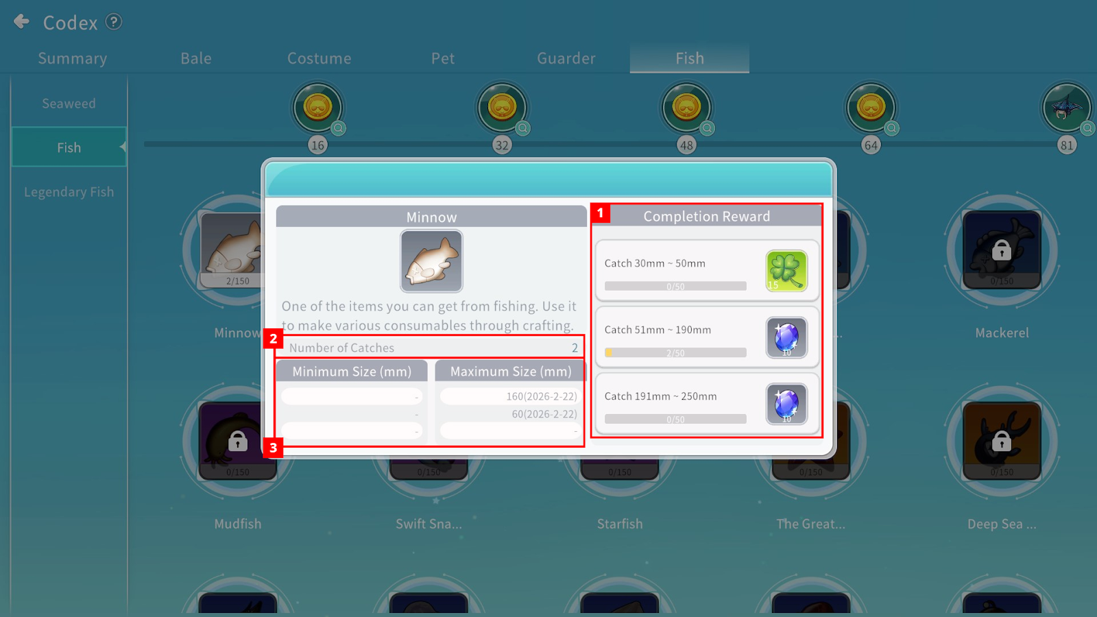 By selecting each fish icon, you can view detailed information and completion rewards.