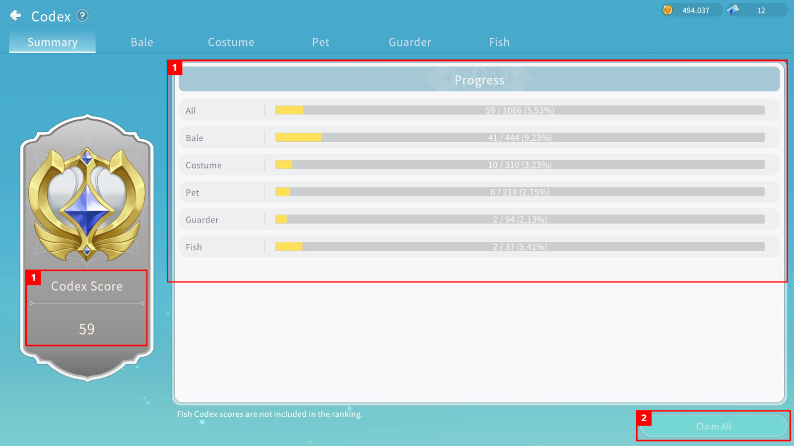 ① In the Codex Summary menu, you can check your Codex score and overall progress.
