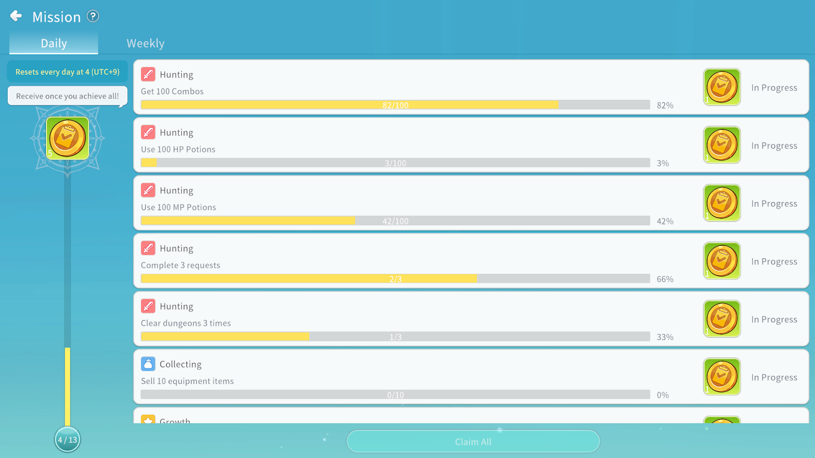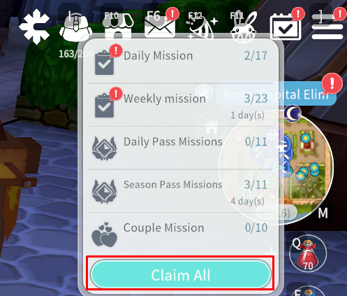Tap the Mission icon at the top-right of the main screen to claim all completed mission rewards at once using the “Claim All” option.