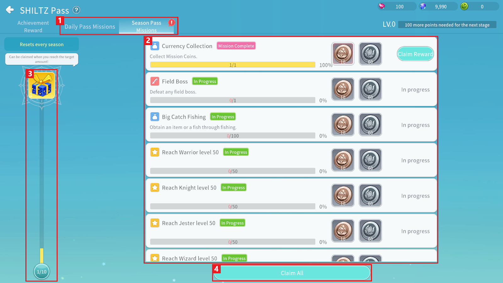 You can obtain rewards according to your mission progress through the Shiltz Pass.