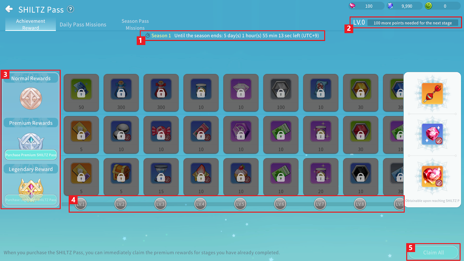 ※ For Daily Pass Missions, after claiming Shiltz Pass Points, you can use Sapphire to obtain additional rewards. (Additional rewards cannot be claimed through “Claim All.”)
