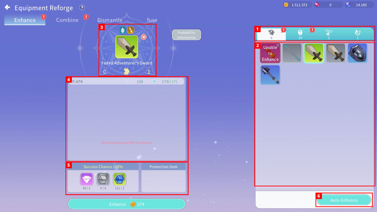- Equipment Destruction: Materials/Currency are consumed, and the Equipment is destroyed. (Using an Equipment Destruction Protection Crystal prevents downgrade and destruction.)