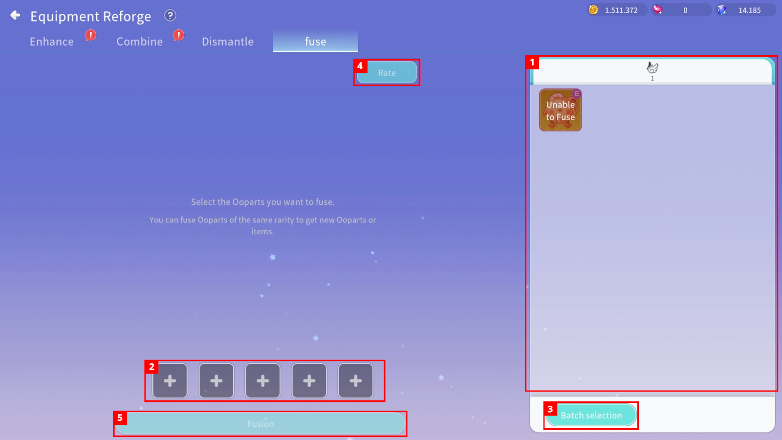 By fusing 5 Ooparts, you can obtain higher-grade Ooparts or grade-based rewards based on probability.