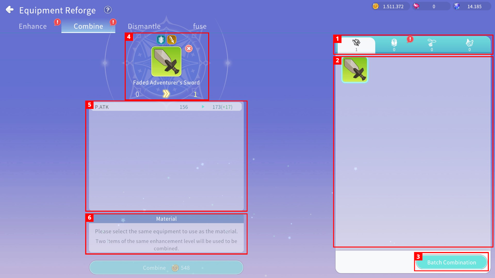 ③ You can register multiple Equipment pieces for Batch Combination (only identical Equipment with identical Enhancement stages).