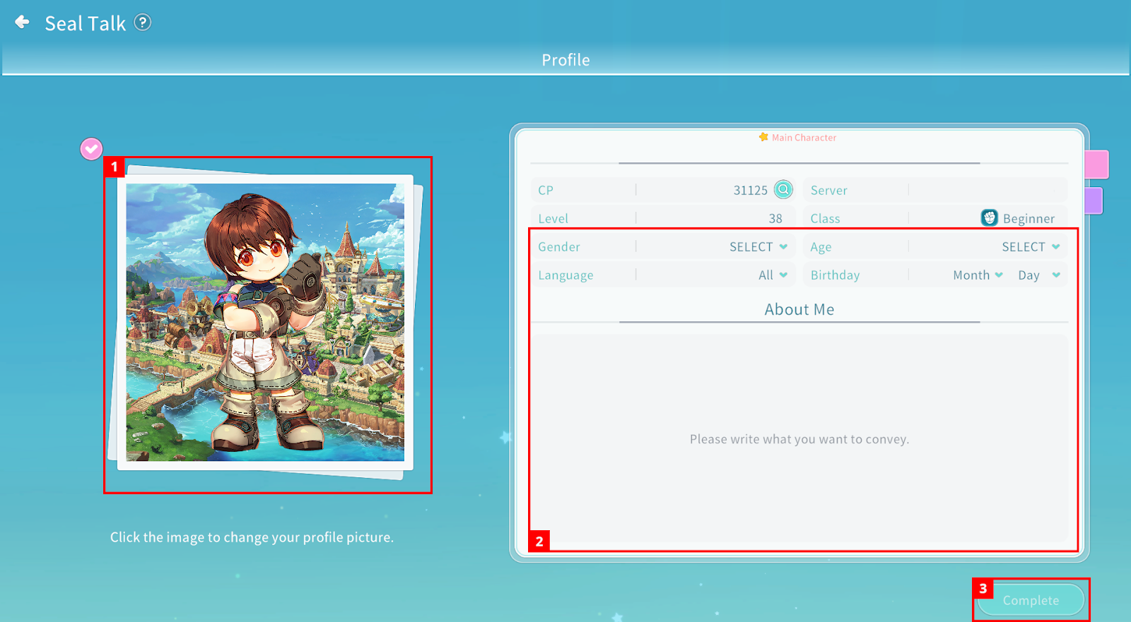② Enter your gender, language, age, birthday, and self-introduction. Combat Power, Server, Level, and Class information are automatically filled in based on your representative character.