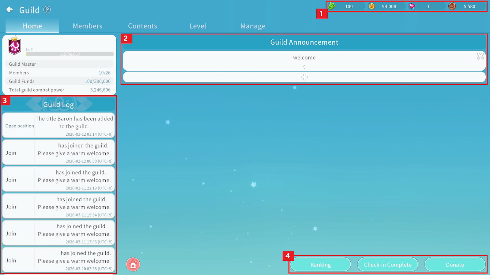 ④ You can access Guild Ranking, Check-in, and Donate.
