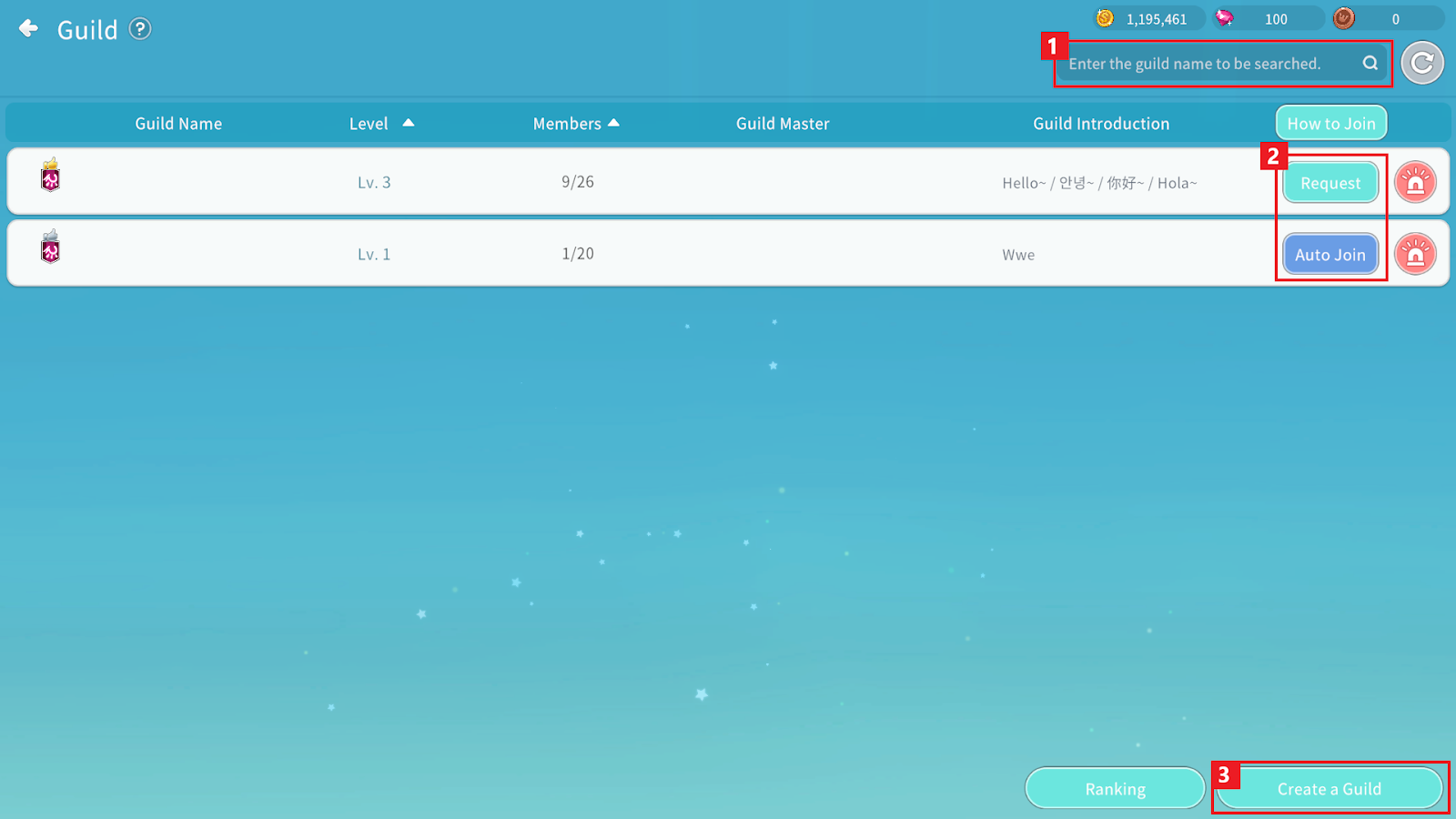 ① If you want like to join an existing Guild, you can search for the Guild by entering its name.