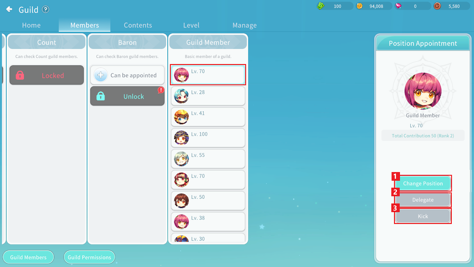 ① You can change the position of the selected Guild member.