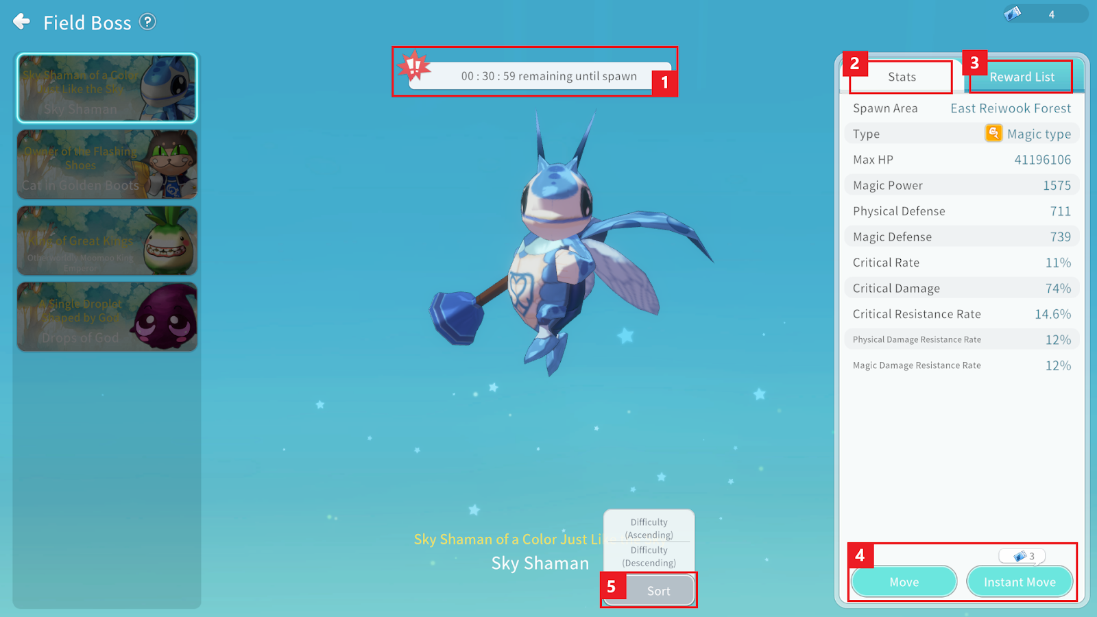 ⑤ You can select the sorting criteria for the Field Boss list displayed on the left.