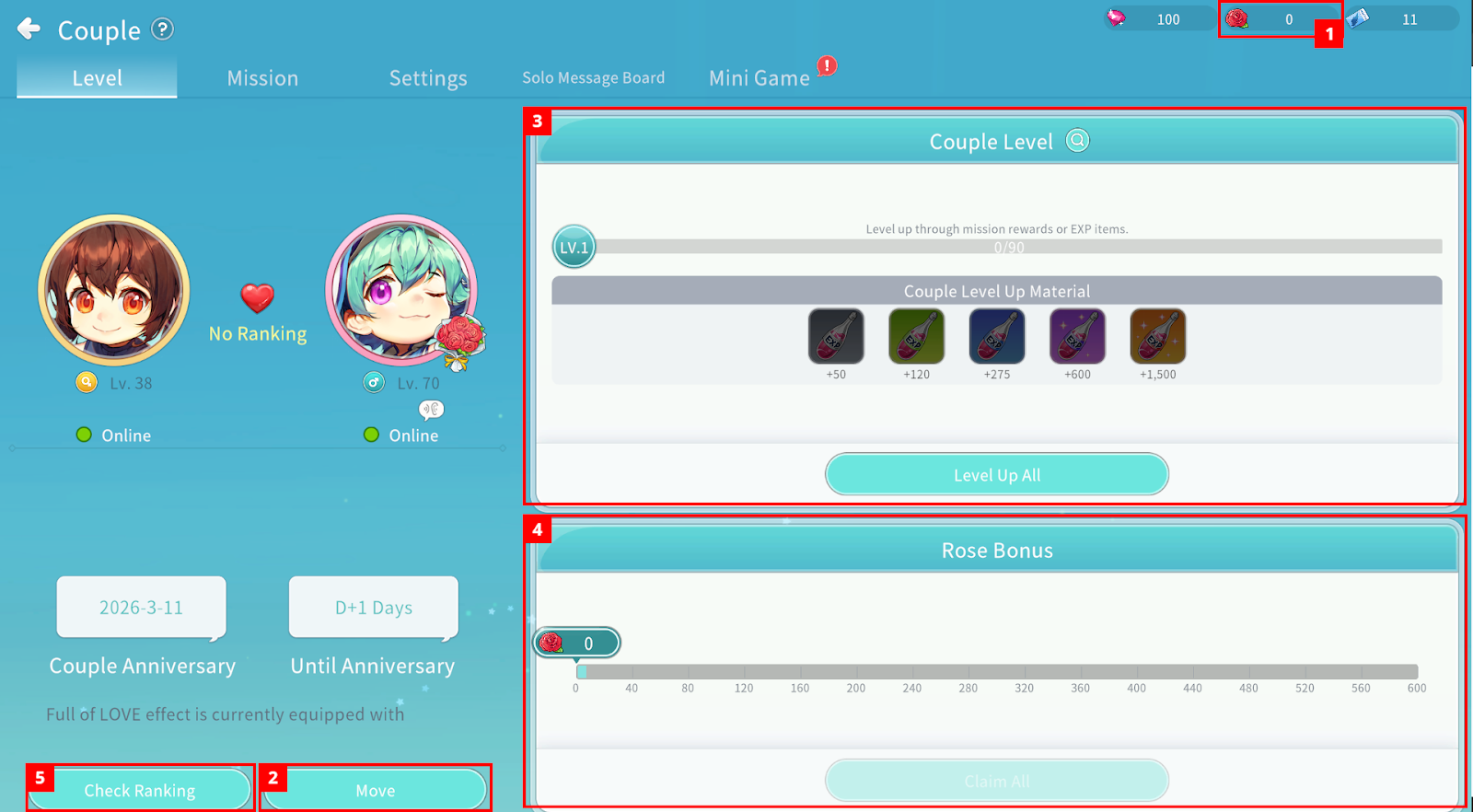 Couple Level can be increased using Couple EXP Potion items.