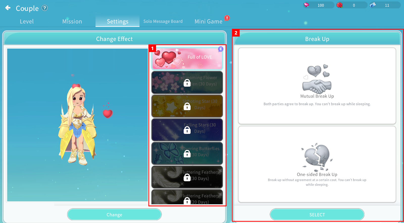In the Couple Settings menu, you can change Couple effects or break up.