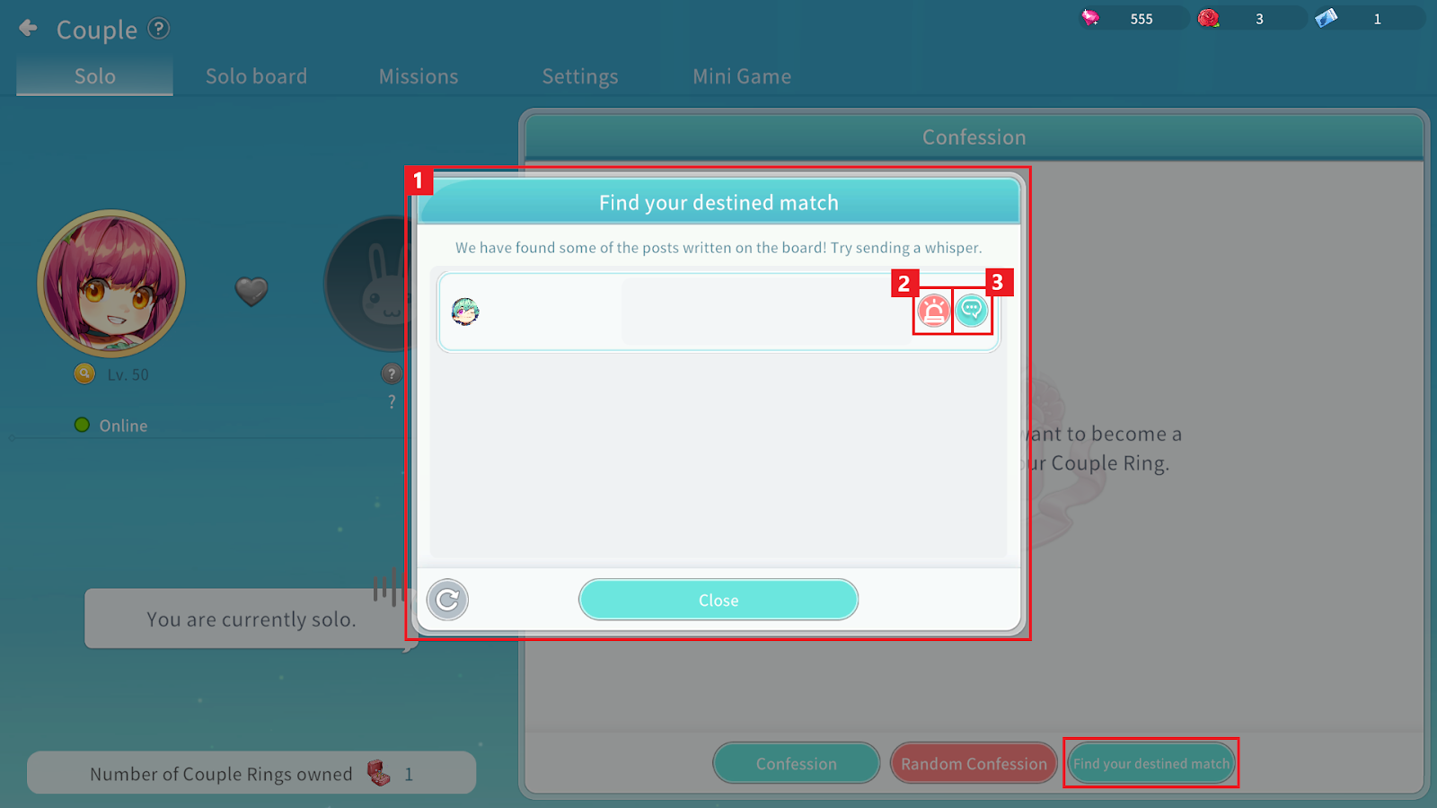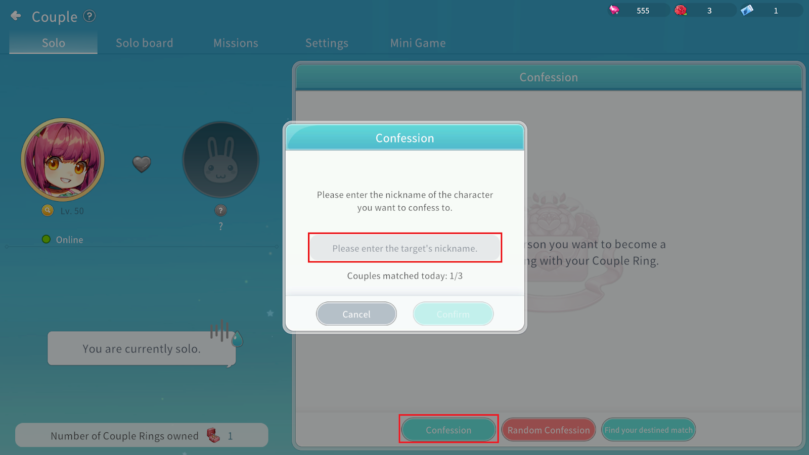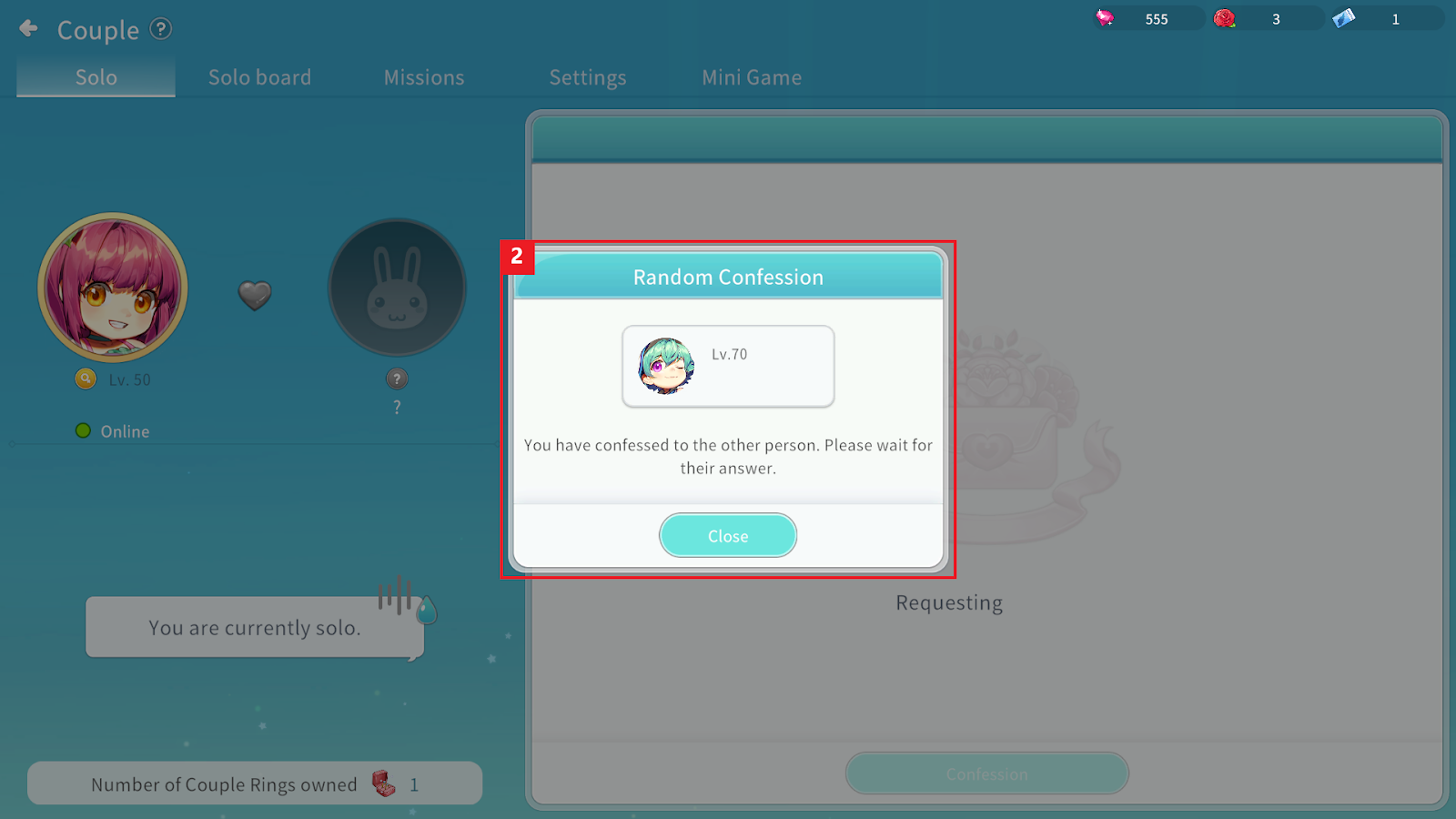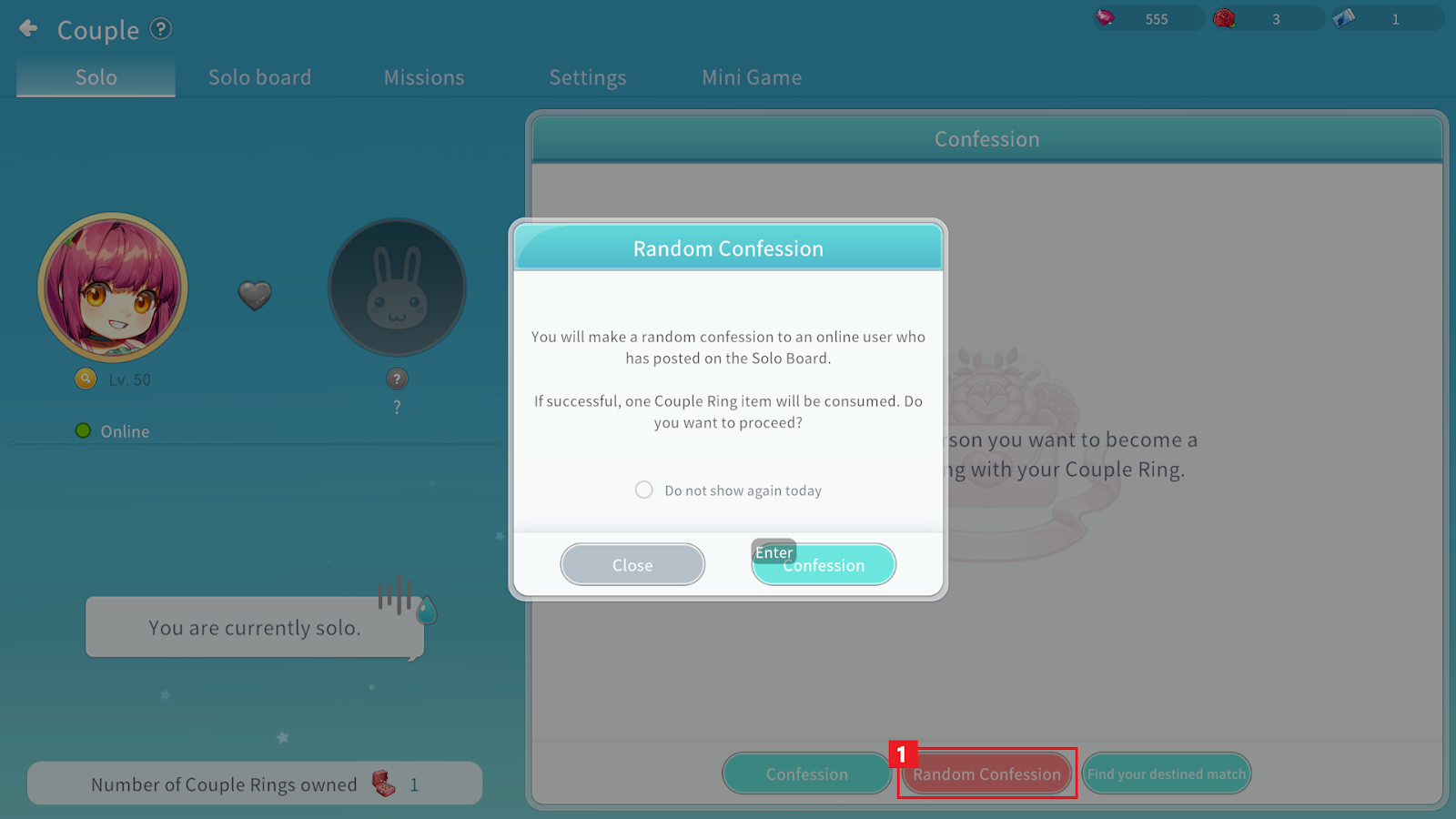 ① Click Random Confession in the Couple menu to propose to an online user who has posted on the Solo Board.