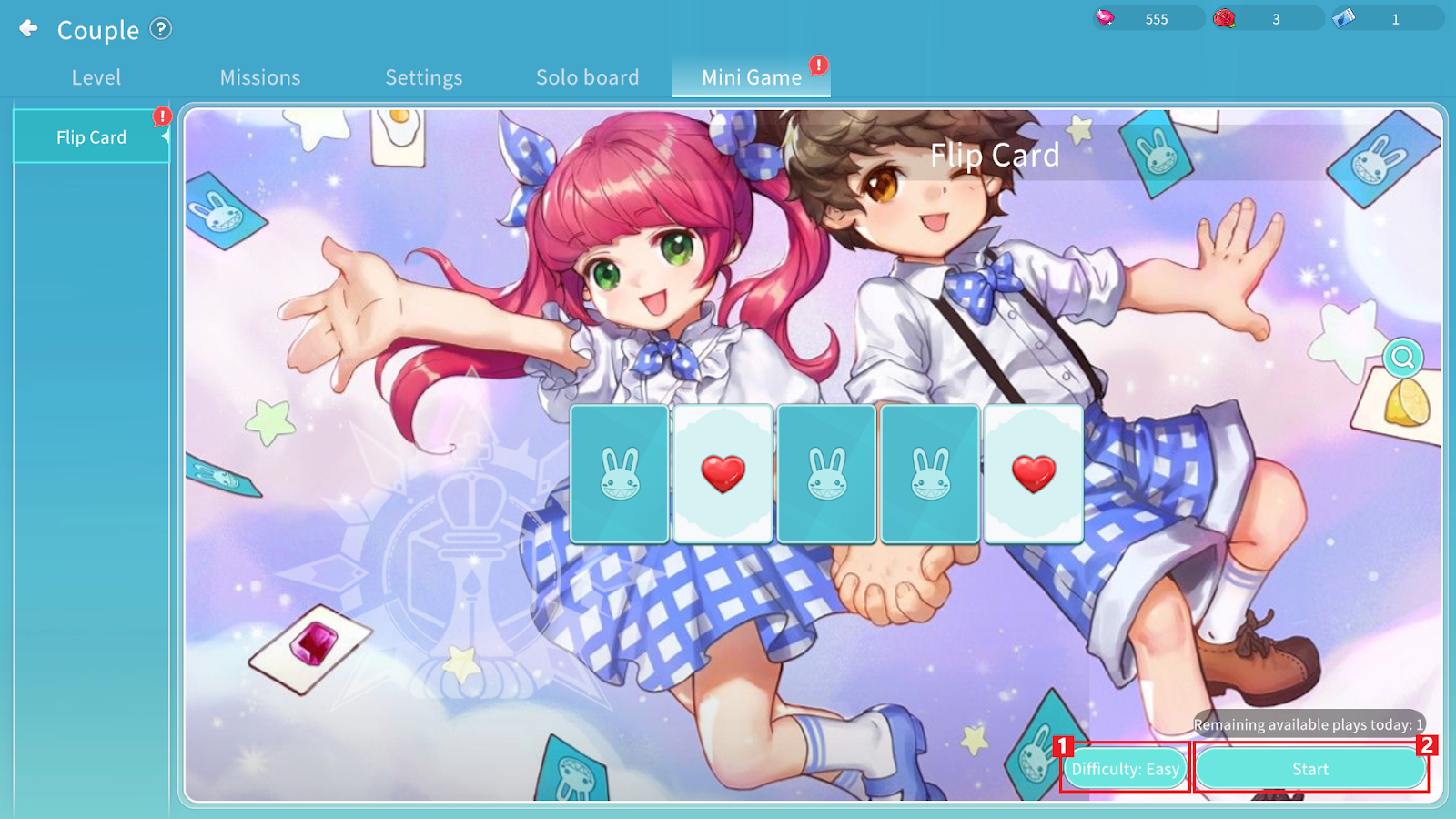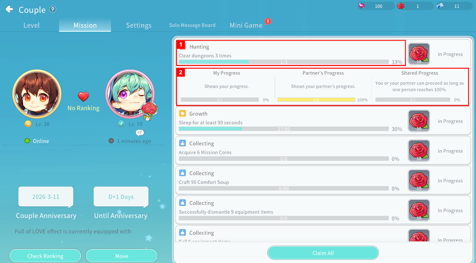 Couples can complete missions together to earn Roses. Missions reset daily.