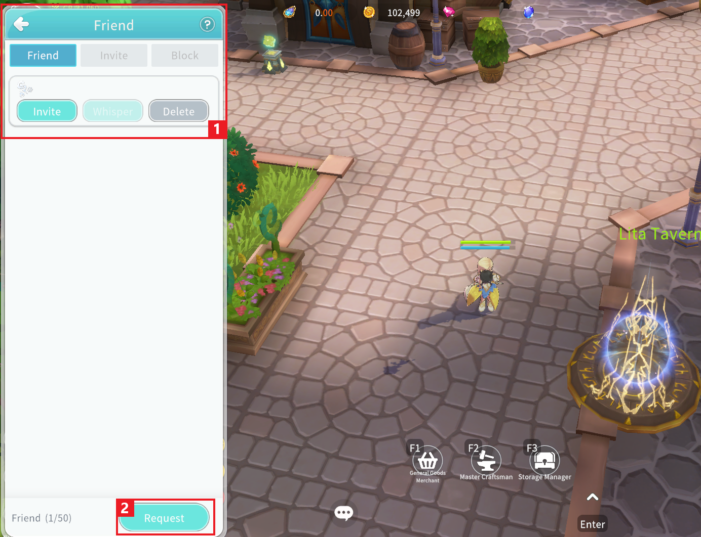 ② Sending a Friend Request: Tap the “Friend Request” button and enter the character name to send a Friend request.