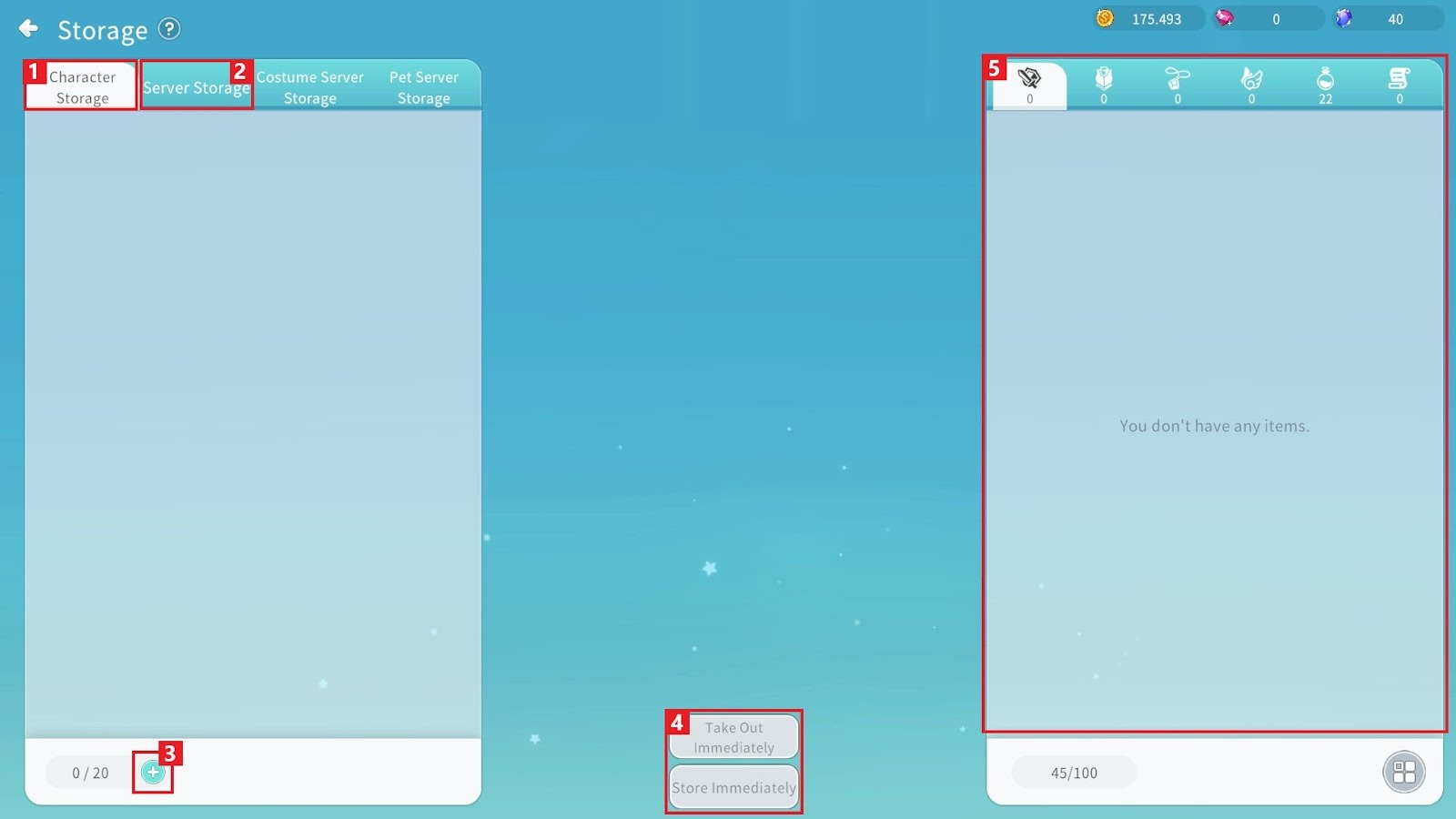 ② “Server Storage” can be used by all characters on the current server.