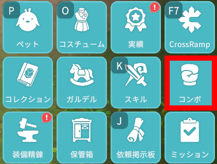 ゲーム内「メニュー」 → 「コンボ」から情報を確認できます。また、該当のメニューから、コンボレベルを上げることができます。